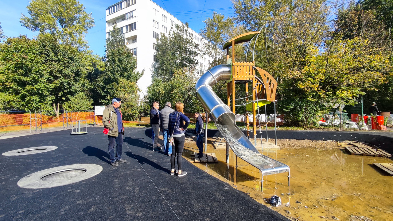 На фотографии группа людей осматривает новую детскую площадку во дворе жилого дома. В центре кадра — высокая игровая башня с металлической горкой-трубой, установленная рядом с лужей, образовавшейся на неоконченной части покрытия. На заднем плане — многоэтажное здание, деревья и временные ограждения. Снимок отражает процесс приёмки и контроля качества благоустройства в рамках муниципальных программ по созданию комфортной городской среды.