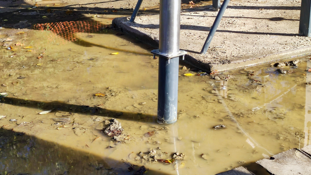 На фотографии крупным планом показана металлическая опора детского игрового комплекса, частично погружённая в мутную воду. Видны бетонное основание, следы грязи и строительных работ. Сцена иллюстрирует проблему водоотведения и недостатков дренажной системы на этапе благоустройства двора. Изображение подходит для технической документации, экспертиз и отчётов о состоянии городской инфраструктуры.