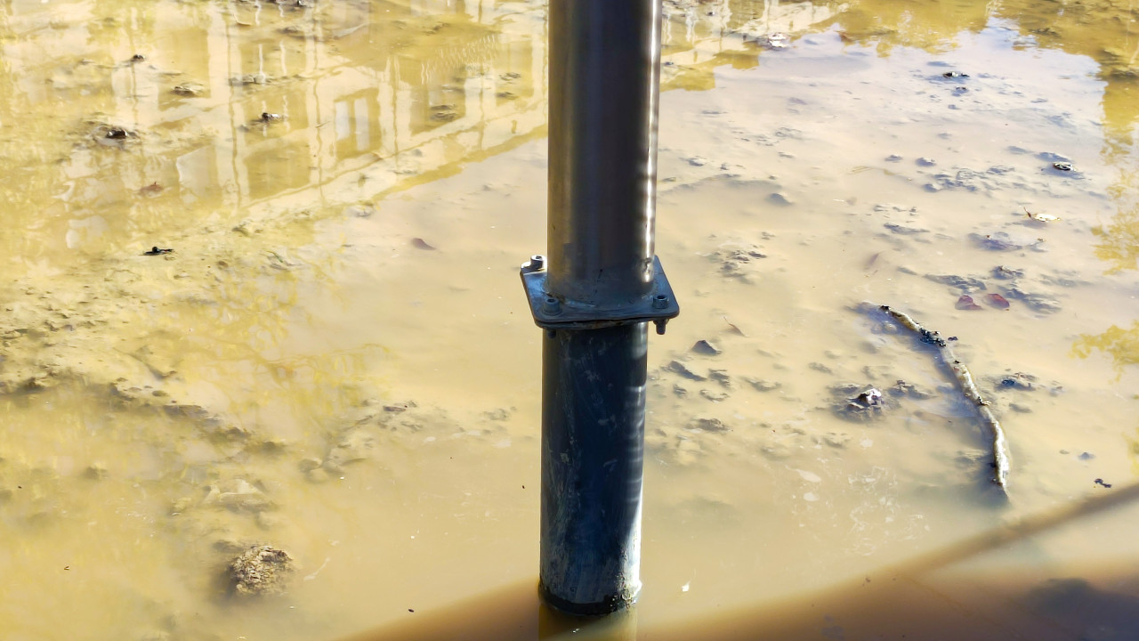 Металлическая опора детского комплекса в стоячей воде