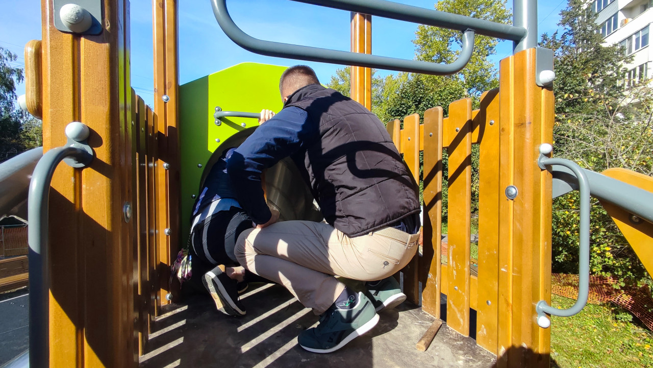 На фотографии изображены двое мужчин, проверяющих внутреннюю поверхность металлической горки на детском игровом комплексе. Люди находятся на верхней платформе, выполненной из дерева и металла, с зелёной панелью в задней части. Снимок отражает процесс приёмки и контроля качества монтажа детского оборудования. На фоне видна растительность и жилые дома, что указывает на городской двор. Изображение можно использовать для публикаций о безопасности, строительных экспертизах и благоустройстве.