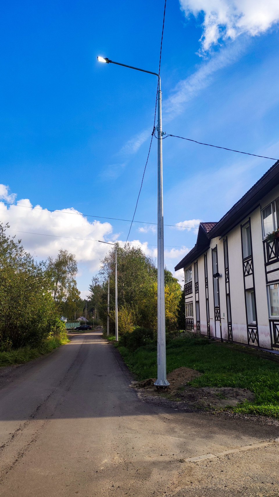 На снимке запечатлена недавно установленная металлическая опора уличного освещения с включённым светильником. Столб оборудован кабелем, протянутым между соседними опорами. На заднем плане — частично асфальтированная дорога, двухэтажные дома с отделкой под фахверк и зелёные насаждения. Погода ясная, что позволяет детально рассмотреть все элементы монтажа. Фото подходит для иллюстрации тем освещения улиц, модернизации инженерных сетей и развития городской инфраструктуры.