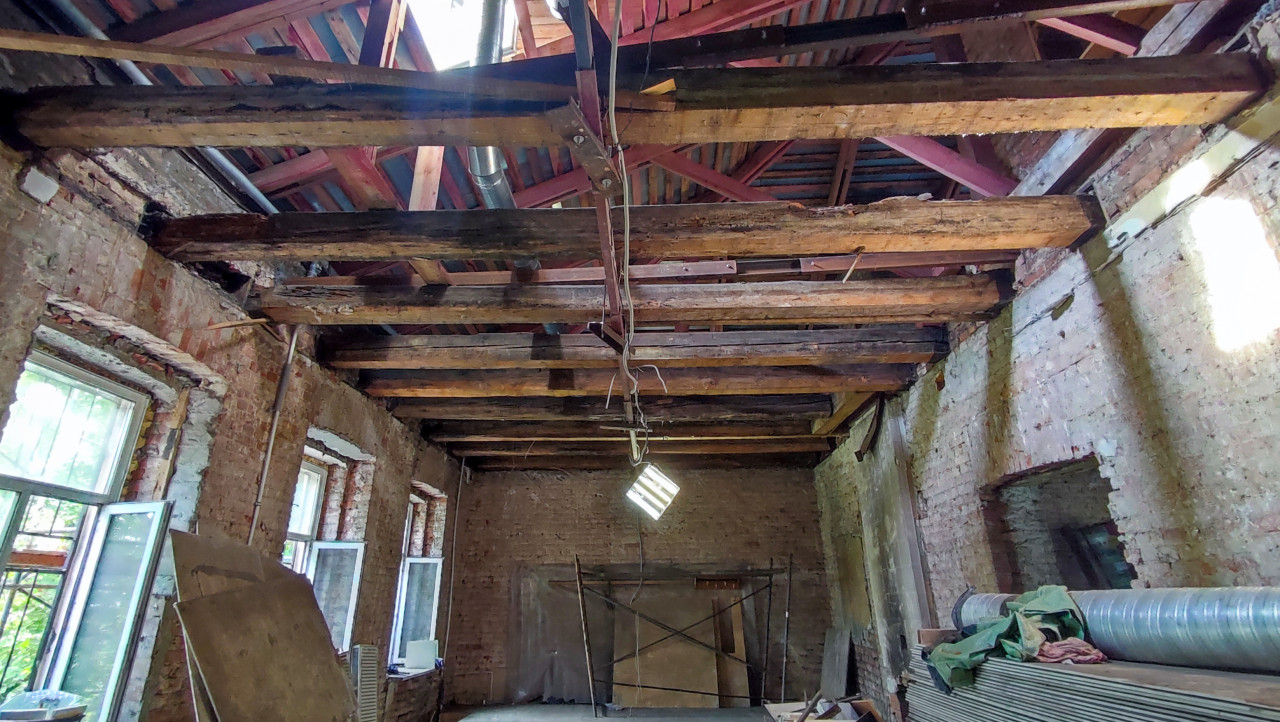 На фото запечатлено внутреннее помещение старого кирпичного здания, находящегося на стадии реставрационных работ. Под потолком видны массивные деревянные балки и металлические связи, формирующие несущую систему. Через окна с металлическими решётками проникает дневной свет, освещая кирпичные стены без отделки. На полу сложены металлические воздуховоды и строительные материалы. Кадр можно использовать в отчётах по обследованию несущих конструкций, в архитектурных исследованиях и публикациях о реконструкции исторических объектов.