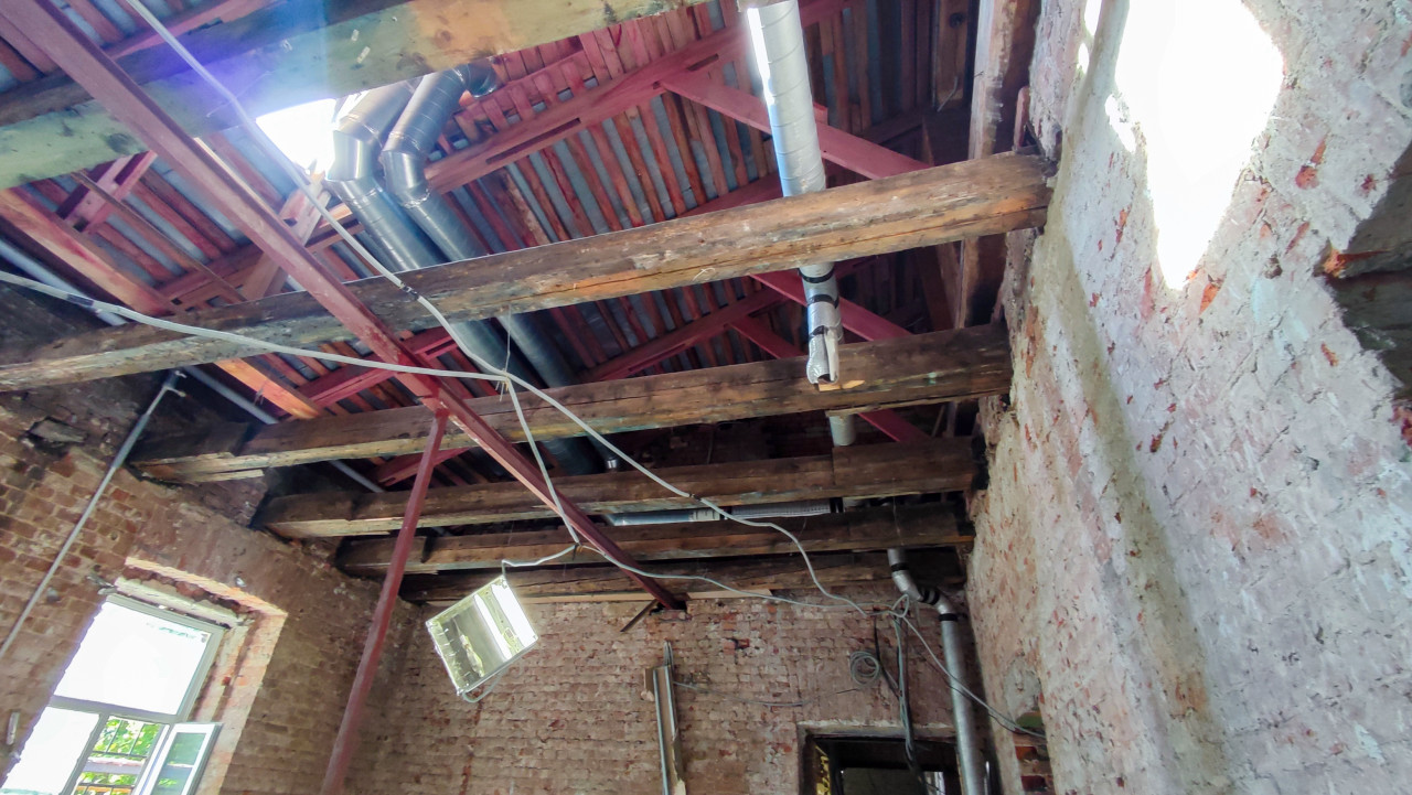 На фотографии запечатлена часть чердачного помещения с деревянными балками, металлическими связями и вентиляционными трубами под кровлей. Видны участки разрушения кладки у оконного проёма и следы строительных работ. Сцена снята в дневное время при естественном освещении. Изображение отражает этап инженерного обследования и подготовки к реставрации здания исторического фонда. Фото можно использовать в технических отчётах, строительных экспертизах и архитектурных исследованиях.