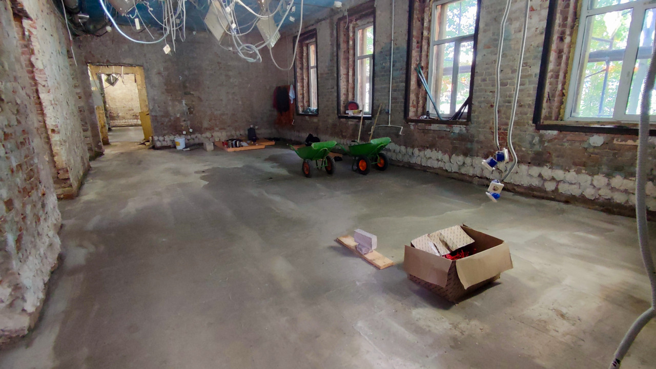 На фото показано помещение старого здания после демонтажа внутренней отделки. Видны кирпичные стены без штукатурки, частично заменённые оконные блоки и новая бетонная стяжка пола. На потолке свисают многочисленные кабели, указывающие на этап прокладки электросетей. В помещении находятся строительные инструменты, зелёные тачки и коробка с материалами. Сцена характерна для этапа черновых работ в процессе капитального ремонта и реконструкции старых зданий. Фотография может использоваться в статьях о реставрации, инженерных работах и строительных процессах.