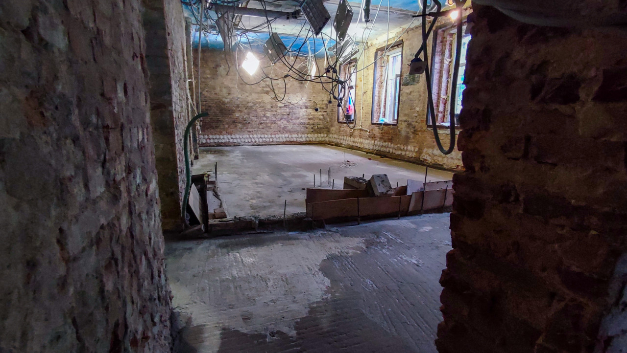 На фотографии показана реконструкция внутреннего помещения старого кирпичного здания. На переднем плане виден участок бетонного пола, где идёт формирование основания и монтаж арматуры. По потолку и стенам проходят временные электрокабели и трубопроводы. Помещение находится на этапе черновых работ перед монтажом инженерных систем и последующей отделкой. Освещение рабочее, часть стен имеет неровности от демонтажа старой штукатурки. Фото отражает типичный этап капитального ремонта и может использоваться в публикациях о строительстве и реконструкции.