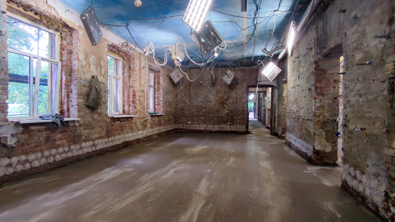 На фото запечатлён длинный коридор старого кирпичного здания, где выполнено черновое выравнивание бетонного пола. Потолок окрашен в голубой цвет, на нём закреплены строительные светильники и временные кабели. По стенам проходят электрические провода и участки старой штукатурки. Вдоль стен расположены окна, пропускающие дневной свет. Этот этап ремонта характерен для реконструкции зданий дореволюционной или советской постройки. Снимок подходит для иллюстрации строительных технологий и этапов капитального ремонта.