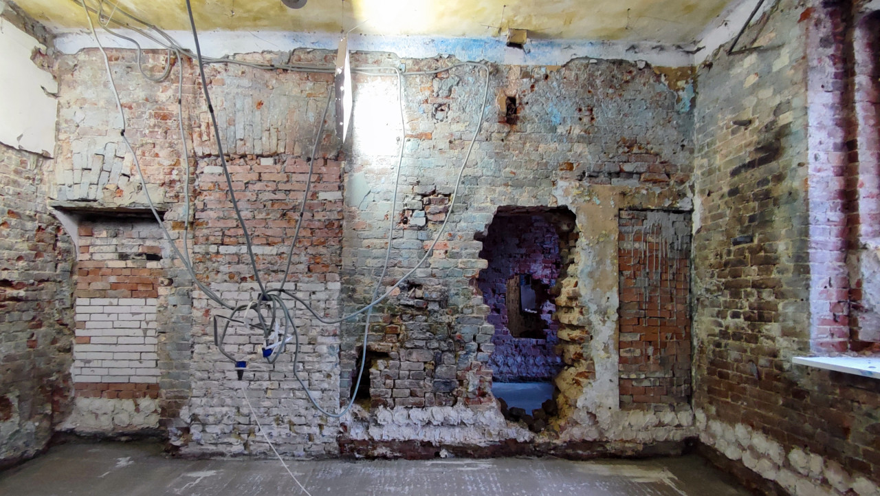 На фотографии изображена стена старого здания с сохранившейся кладкой из красного и белого кирпича. Видны заложенные и пробитые проёмы, следы штукатурки и электропроводки. Потолок окрашен в жёлтый цвет, а по стенам идут временные кабели. Состояние помещения указывает на активную фазу реконструкции, когда происходит раскрытие старых конструкций для последующего восстановления. Фото может использоваться для материалов о реставрации, обследовании зданий и процессе капитального ремонта.