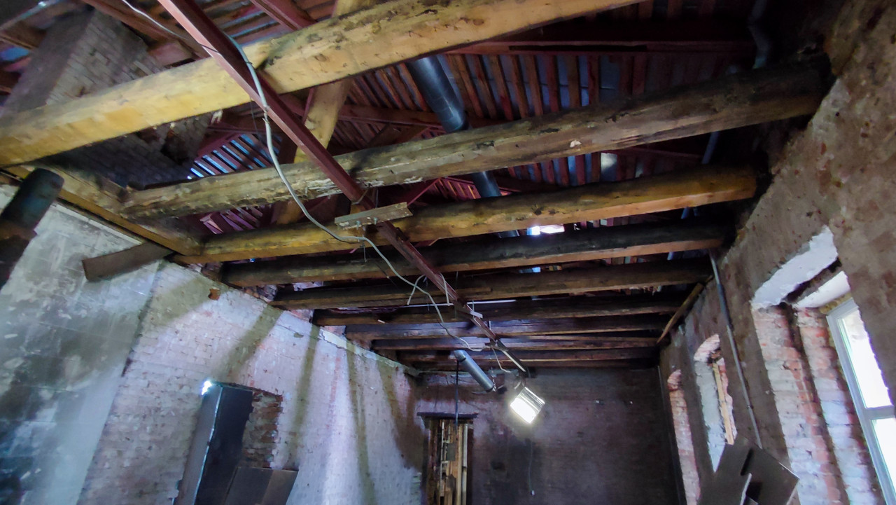 На фотографии показано помещение старого кирпичного здания с деревянными балками и металлическими элементами кровельной конструкции. Потолок частично открыт, видны инженерные трубы и кабели. Через окна поступает дневной свет, освещая кирпичные стены и строительные материалы на полу. Этот этап демонстрирует процесс восстановления несущих конструкций при капитальном ремонте. Фото может использоваться для иллюстрации строительных технологий, реставрации архитектурного наследия и инженерных решений.