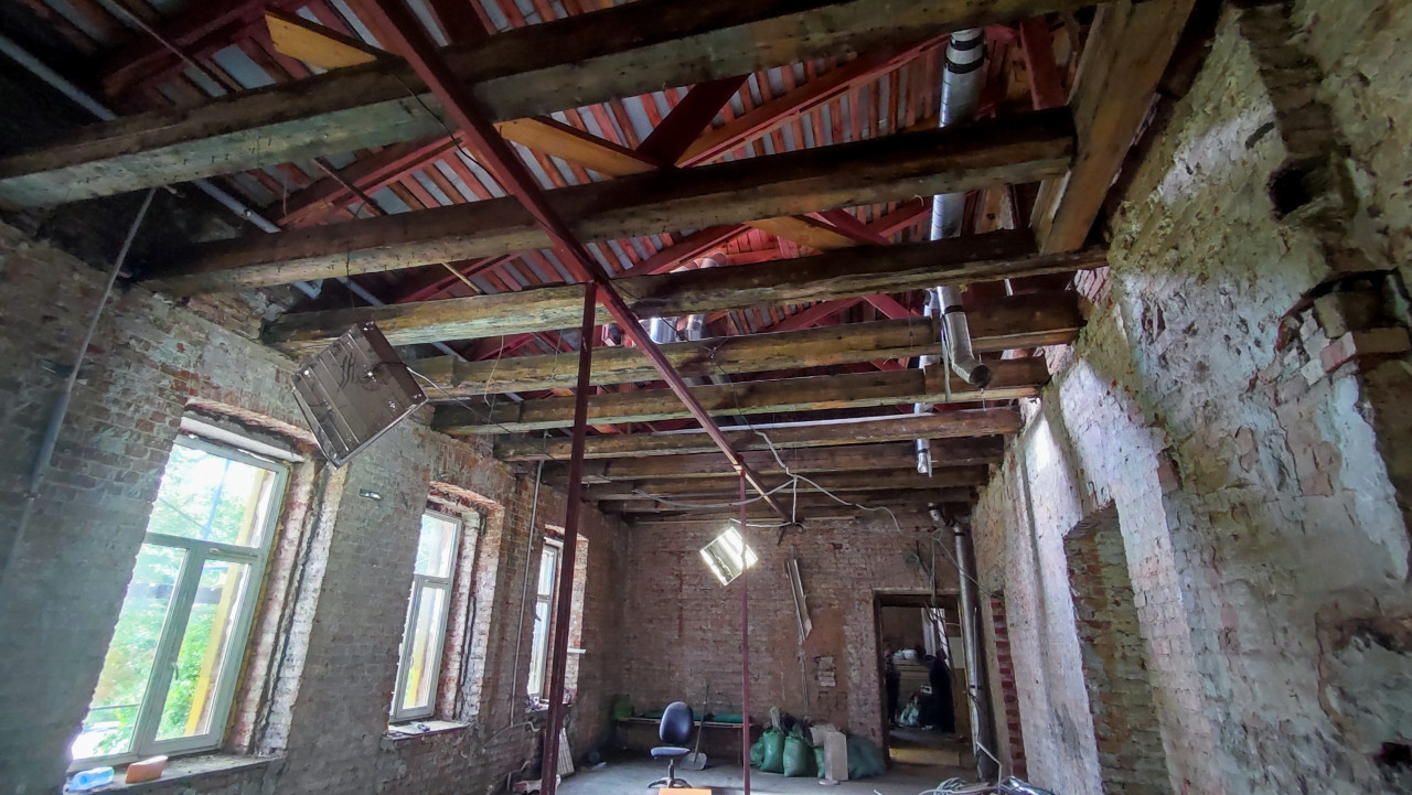На фотографии изображено помещение старого кирпичного здания, находящегося в стадии капитального ремонта. Видны оголенные кирпичные стены, деревянные балки перекрытий и металлические элементы временного усиления конструкции. Потолочные балки частично перекрывают красноватый металл кровли, под которым видны воздуховоды и электропроводка. На полу строительный мусор, пластиковые мешки и временная мебель. Судя по высоте потолков и типу кладки, здание может относиться к архитектуре конца XIX — начала XX века, что характерно для дореволюционных построек Санкт-Петербурга и Ленинградской области. Фотография может использоваться в материалах о реконструкции исторических зданий, обследовании несущих конструкций, ремонте чердачных помещений и анализе состояния кирпичной кладки.