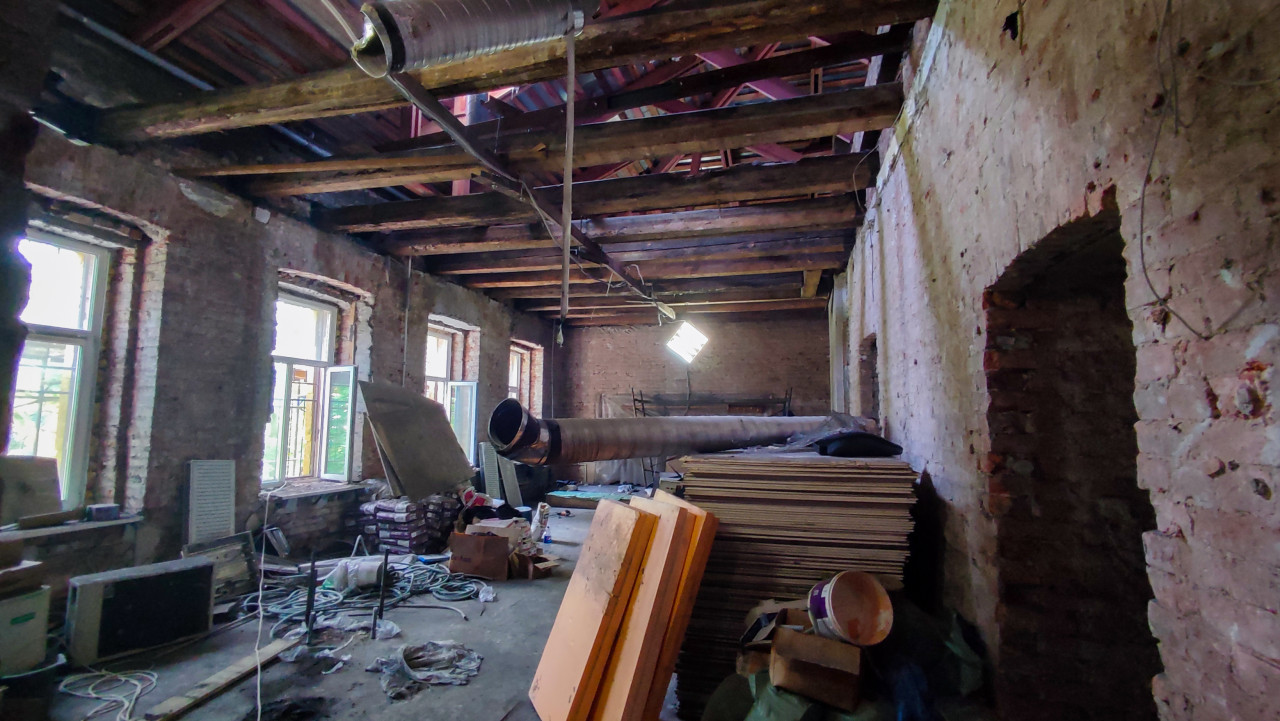 На снимке изображено большое помещение с кирпичными стенами и открытыми деревянными балками перекрытия. На полу находятся строительные материалы, трубы, кабели и листы утеплителя. В окнах виден дневной свет. Кадр документирует состояние объекта во время реконструкции и может использоваться в строительной экспертизе, при оценке технического состояния и планировании восстановительных работ.