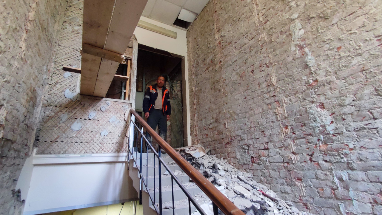 На фото изображён лестничный пролёт в старом кирпичном здании, где ведутся работы по демонтажу внутренней отделки и расчистке поверхностей. Сам марш из железобетона или камня сохранён, однако ступени и площадка покрыты строительным мусором и фрагментами штукатурки. Стены оголены до кирпича, на них видны следы старых ремонтных слоёв. Рабочий в сигнальной куртке проводит визуальное обследование состояния конструкции и контролирует безопасность. Снимок отражает промежуточный этап реконструкции и может использоваться в инженерных отчётах, строительных экспертизах и технической документации.