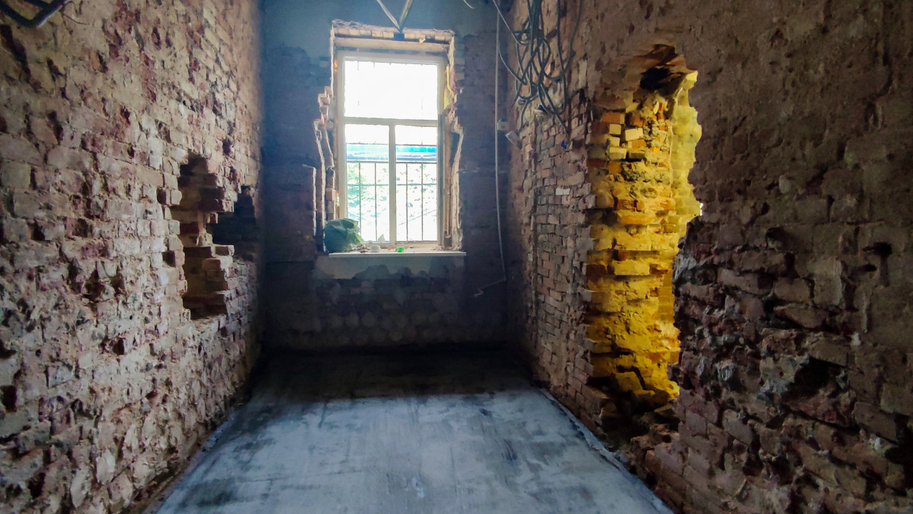 На фотографии показано узкое помещение в старом здании с оголёнными кирпичными стенами и повреждёнными проёмами. Через окно с решёткой попадает дневной свет, на подоконнике лежит зелёный строительный мешок. В стенах видны следы утраты кирпича и разрушенные участки кладки, требующие реставрации. На полу выполнена свежая цементная стяжка. Снимок отражает этап обследования и укрепления конструкций при капитальном ремонте объектов дореволюционной застройки и может использоваться в технической и экспертной документации.