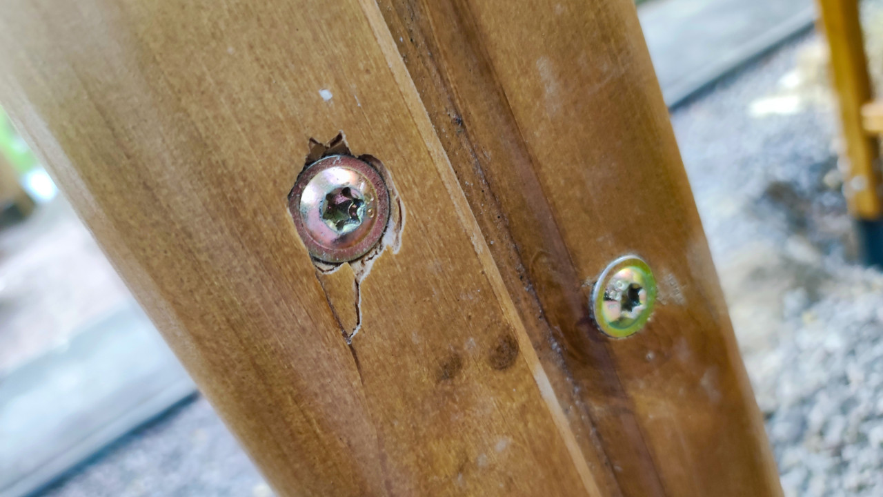 Крупный план деревянного элемента конструкции с двумя саморезами, вокруг одного из которых заметны трещины и расщепление древесины. Поверхность обработана лаком, но видны следы повреждения от неправильного вкручивания крепежа. Фото отражает строительный дефект при монтаже уличных деревянных конструкций. Может использоваться для экспертных отчетов, материалов по контролю качества и обучающих публикаций в сфере благоустройства.