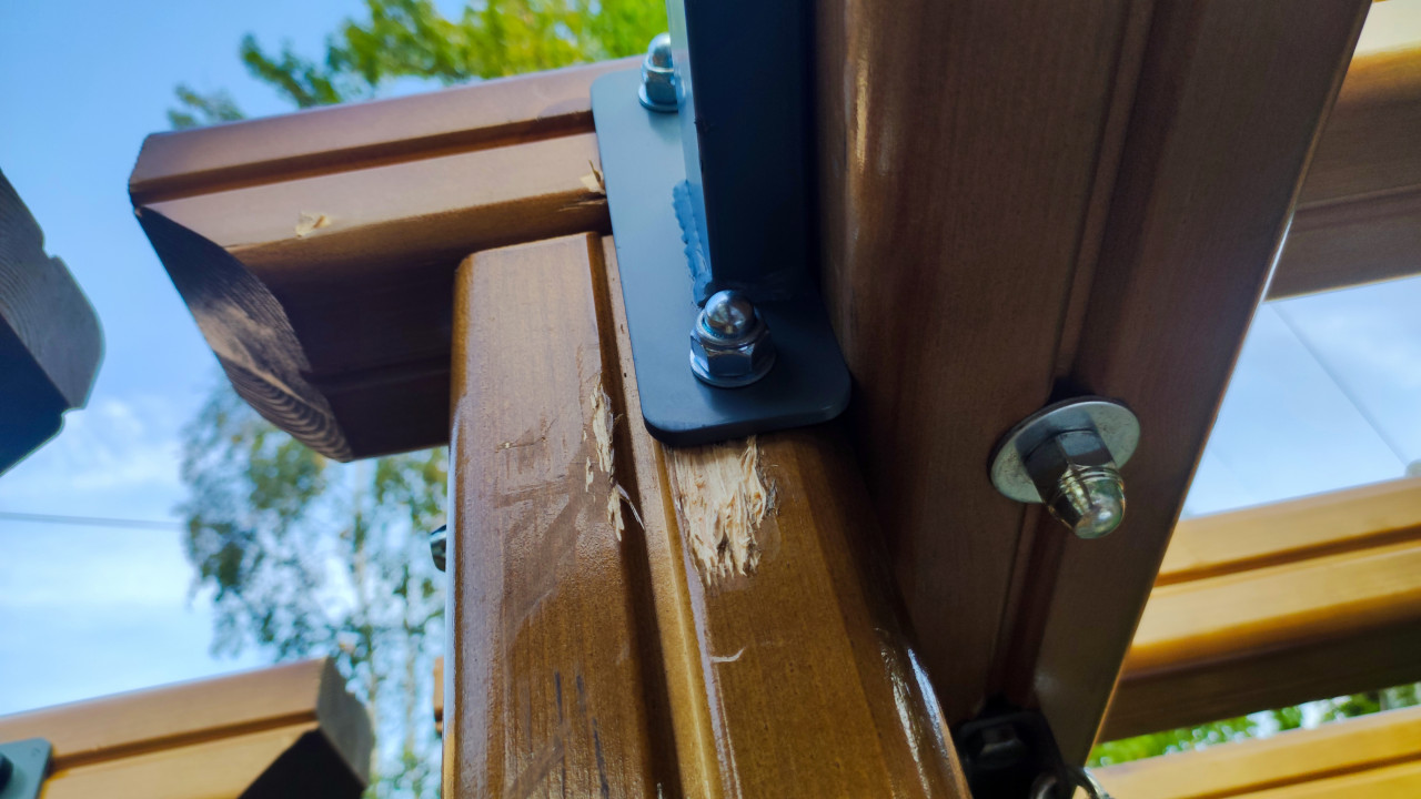 На снимке изображен фрагмент соединения двух деревянных элементов перголы при помощи металлической пластины и болтов. Видны следы механических повреждений и сколов на древесине, а также места крепления гаек и шайб. Фотография сделана на этапе монтажа конструкции на открытом воздухе. Используется в документации по контролю качества, строительных экспертизах и учебных материалах по сборке деревянных архитектурных форм.