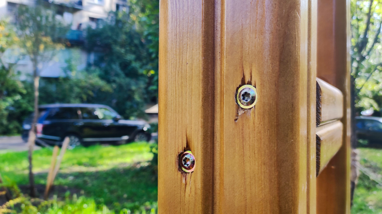 На фотографии крупным планом показаны саморезы, закреплённые в деревянной стойке наружной конструкции. Металл блестит на солнце, а вокруг отверстий заметны незначительные следы вдавливания древесины. На заднем плане виден участок благоустроенного двора с автомобилем и зелёными насаждениями. Снимок иллюстрирует элементы сборки уличных конструкций из клеёного бруса, применяемых при установке малых архитектурных форм.