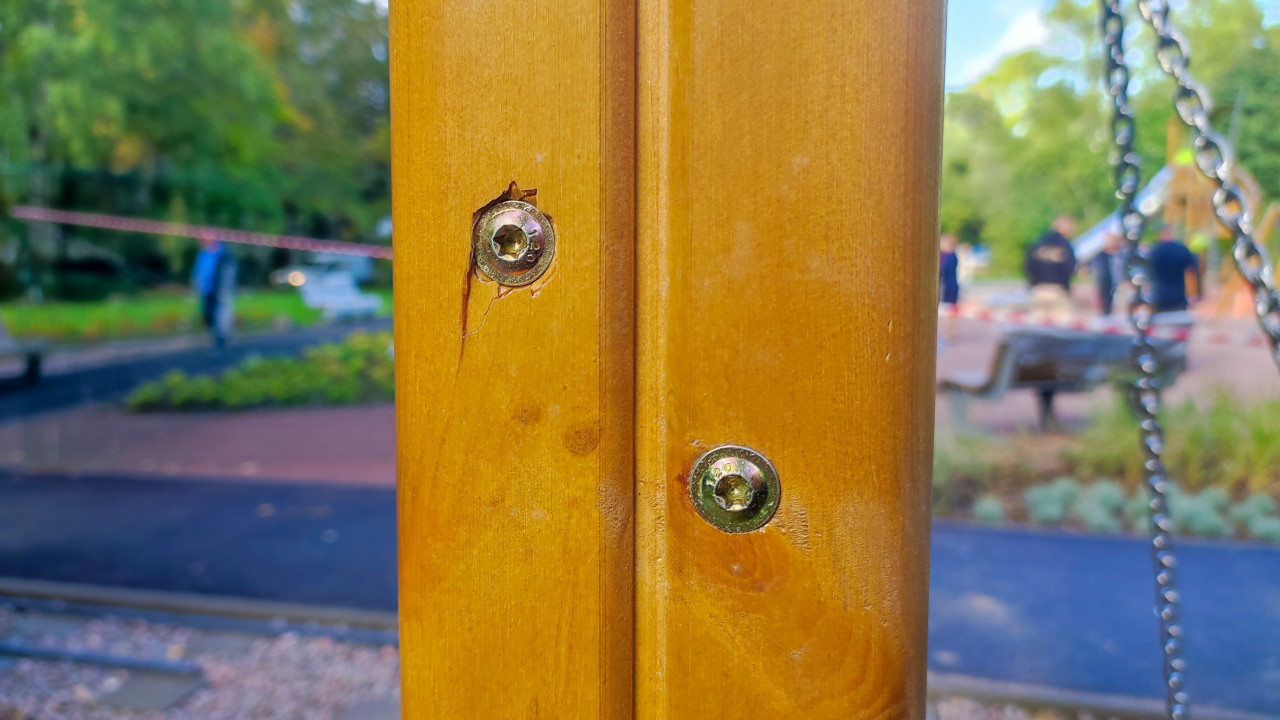 На фотографии показан фрагмент деревянного элемента с ввинченными болтами, вокруг которых образовались трещины и сколы лакированного покрытия. На заднем плане видны элементы благоустроенной территории — лавочки, дорожка и люди за ограждением. Изображение может использоваться для анализа качества монтажа, визуального осмотра конструкций и демонстрации типичных дефектов при установке деревянных архитектурных форм.