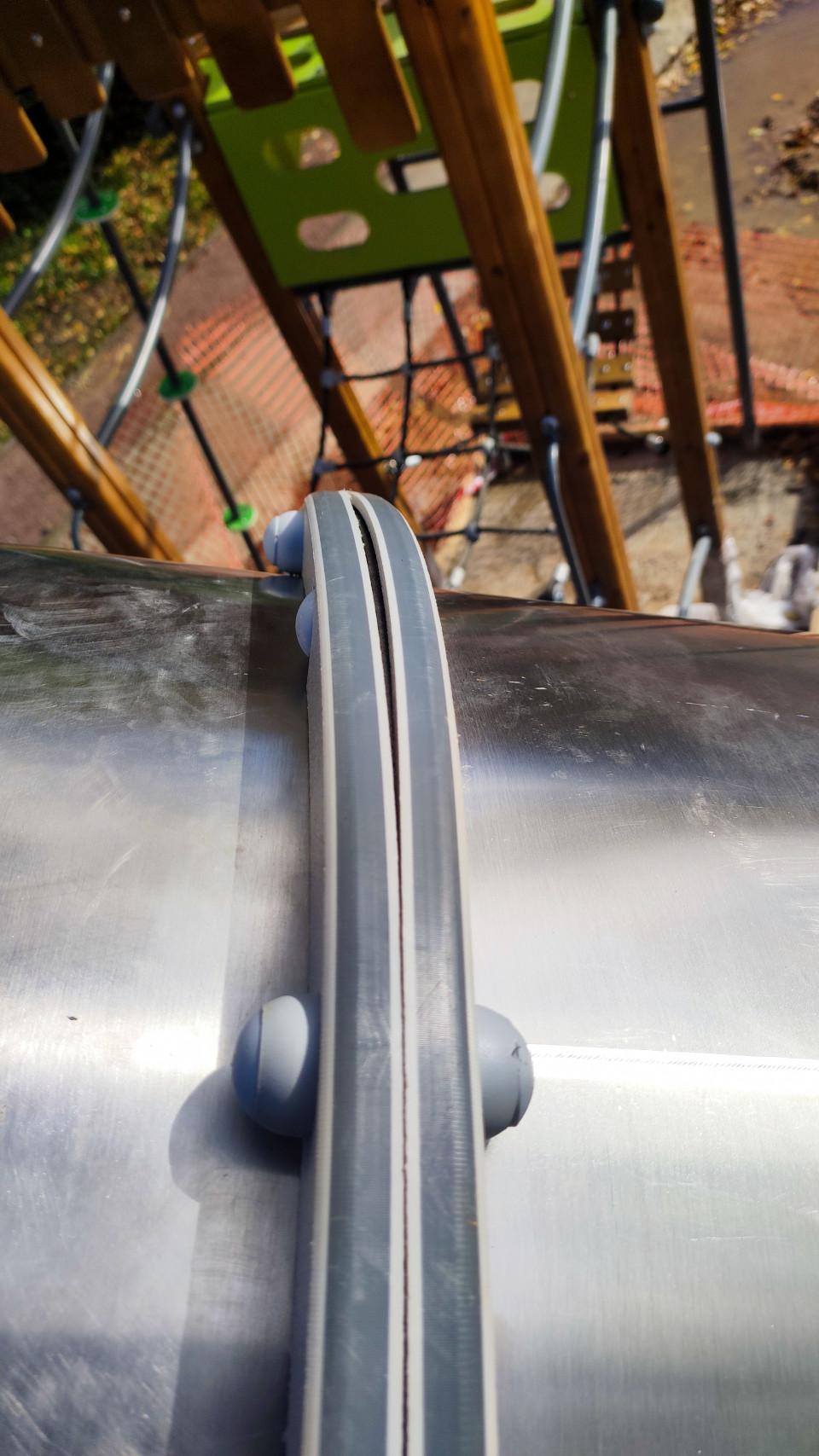 На фотографии крупным планом показан стык двух секций металлической горки с пластиковыми вставками и крепёжными элементами. Поверхность выполнена из нержавеющей стали, а конструкция закреплена болтами с пластиковыми заглушками. Снимок отражает технические детали сборки оборудования для детских площадок и может использоваться для иллюстрации стандартов безопасности и монтажа малых архитектурных форм.