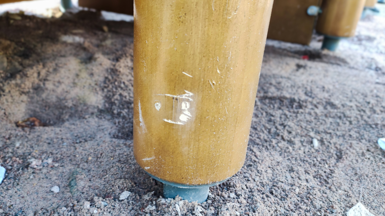 На снимке крупным планом показана деревянная опора детского игрового комплекса с видимыми царапинами и следами повреждения покрытия. Опора установлена в песчаное основание, вокруг виден строительный грунт. Фотография фиксирует техническое состояние элемента и может использоваться для визуальной экспертизы качества монтажа или состояния оборудования на площадке.