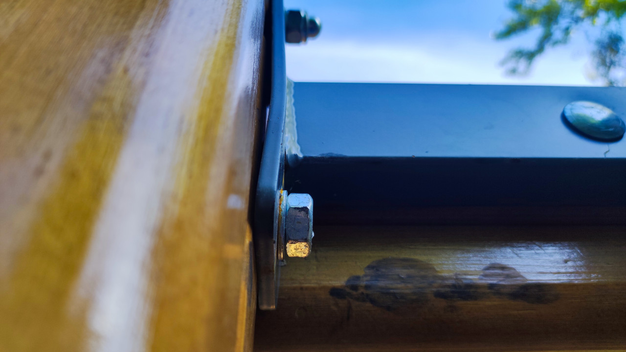 На фото крупным планом показан узел соединения металлической пластины с деревянной балкой с помощью болтов и шайб. Деталь относится к конструкции малой архитектурной формы, вероятно, перголы или качели, установленных на открытой территории. Видно точное сопряжение металла и древесины, а также аккуратную обработку поверхности. На заднем плане — фрагмент голубого неба и ветви деревьев. Изображение иллюстрирует элементы крепежа, монтажные решения и детали сборки наружных деревянных конструкций.