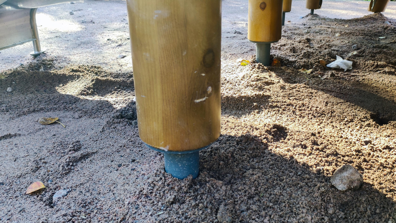 Деревянные опоры игрового комплекса в песчаном основании