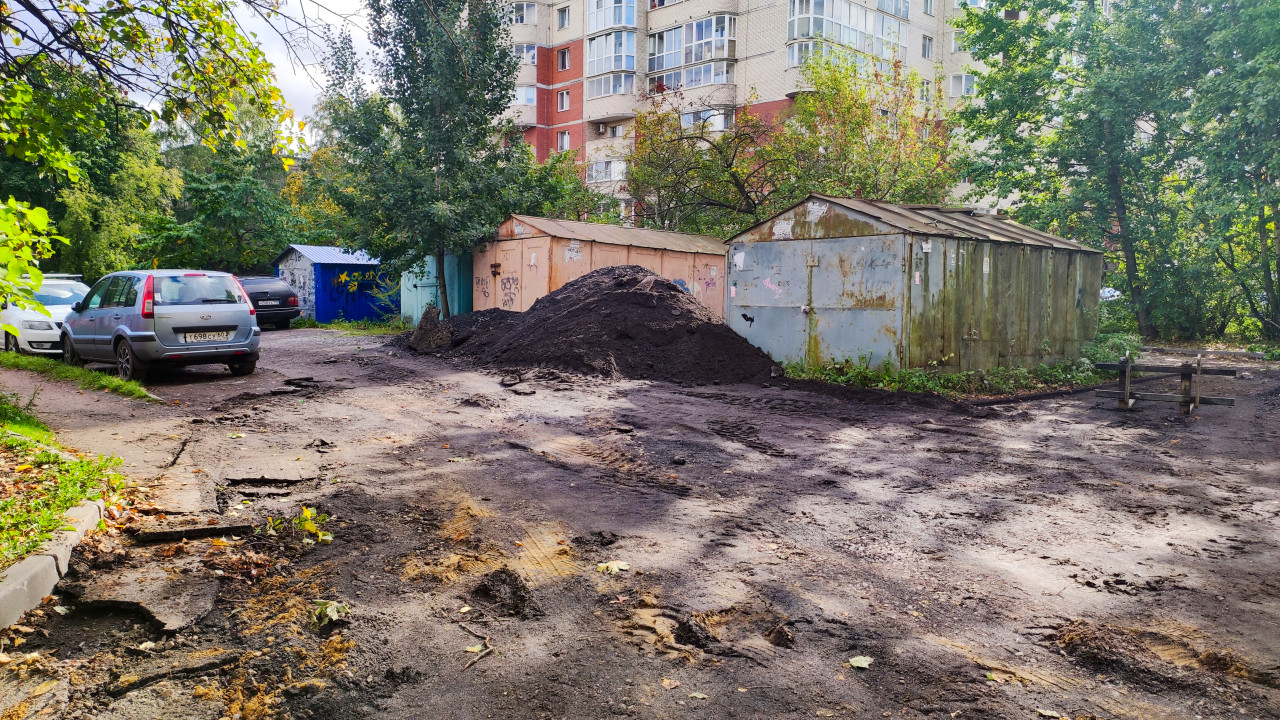 На снимке показана придомовая территория с металлическими гаражами и кучей снятого грунта после дорожных работ. Покрытие неравномерное, местами разрушено, видны следы техники и фрагменты старого асфальта. Вдоль участка припаркованы автомобили, на заднем плане — многоэтажные жилые дома. Территория окружена зелёными деревьями, типичными для городской среды. Фотография отражает реальное состояние дворового благоустройства в процессе ремонта и может использоваться для документирования состояния придомовых территорий и технических отчётов.