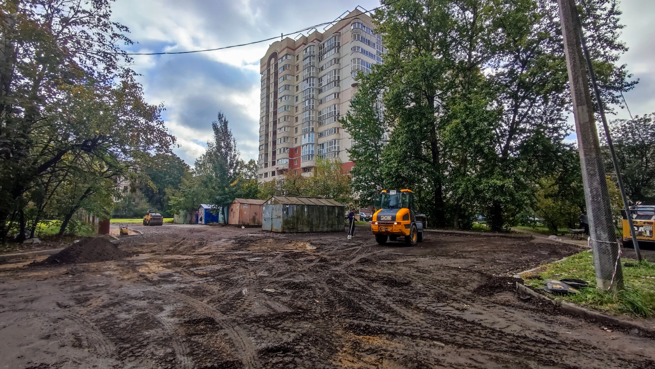 На фотографии изображён процесс подготовки основания под асфальтирование во дворе многоэтажного жилого дома. На переднем плане виден утрамбованный слой грунта и строительная техника — дорожный каток JCB. На заднем плане располагаются металлические гаражи, деревья и высотный жилой дом с остеклёнными балконами. Погода пасмурная, что характерно для осеннего сезона в северных регионах. Фотография отражает типичный этап благоустройства придомовой территории — уплотнение основания перед укладкой асфальта. Подходит для иллюстраций в материалах о дорожных и строительных работах, реконструкции городских дворов и инженерном контроле качества.