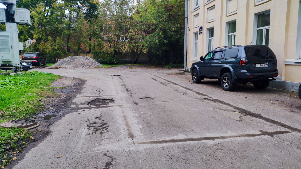 Участок с повреждённым асфальтом и складом щебня у здания