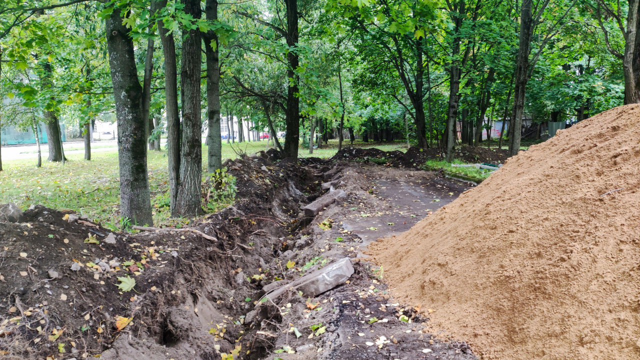 Фотография фиксирует участок парковой территории, где ведутся земляные работы по устройству траншеи. Рядом с линией раскопа — насыпи из песка и вынутого грунта. Деревья растут вплотную к траншее, что типично для реконструкции подземных сетей в зеленых зонах городов. Видны остатки старого покрытия и следы техники. Снимок может быть использован в материалах по инженерным коммуникациям, благоустройству и экологическому контролю при проведении строительных работ вблизи деревьев.