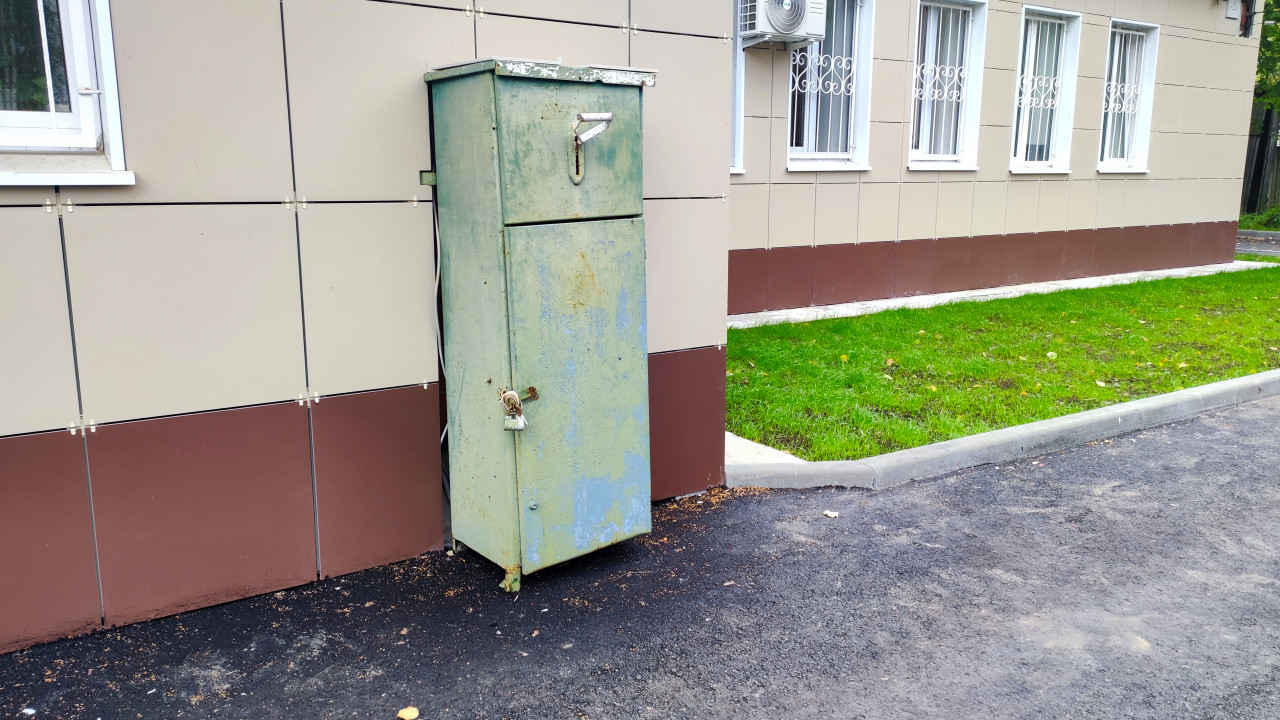 Уличный электрощит у фасада здания