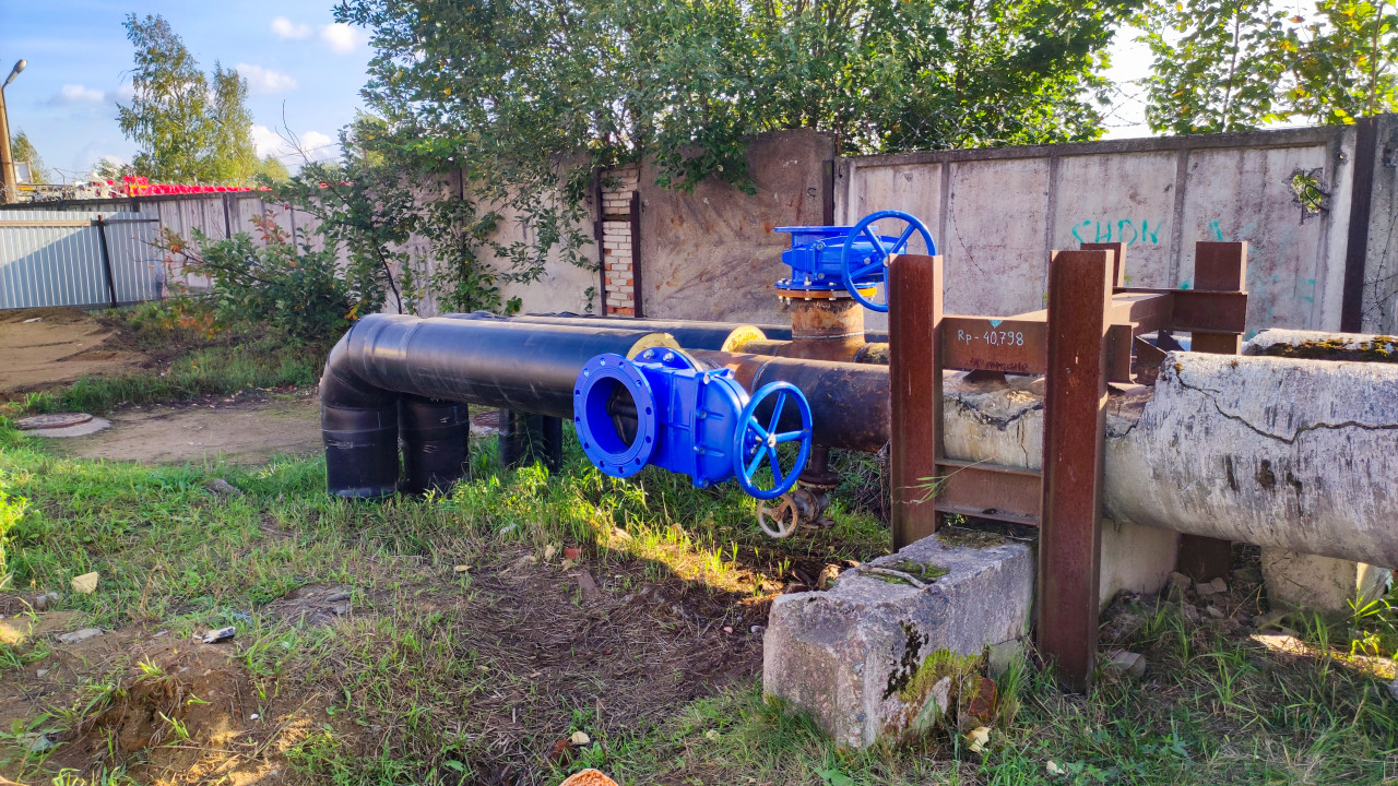 На снимке запечатлён участок инженерного трубопровода, оборудованный новыми синими задвижками и соединительными элементами. Металлические трубы частично закреплены на опорах и проходят вдоль бетонного основания. На фоне видны ограждение и деревья. Фото отражает этап модернизации или ремонта водопроводных или тепловых сетей. Подходит для иллюстраций по инженерным коммуникациям, строительному надзору и инфраструктурным проектам.