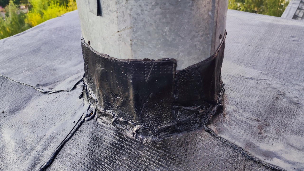 На фото крупным планом показан узел примыкания рулонного кровельного материала к металлической трубе. Герметизация выполнена с использованием мастики и битумного покрытия, заметны следы сварки и проклейки швов. Снимок иллюстрирует процесс гидроизоляции кровельных проходов, применяемый при ремонте плоских крыш многоквартирных домов. Материал подходит для использования в строительных отчётах, экспертизах и технических статьях по кровельным системам.