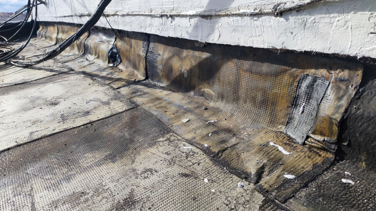 На фото показан участок кровли у стены здания, где выполнено примыкание рулонного гидроизоляционного материала. Видны электрические кабели, элементы старого покрытия и следы ремонта мастикой. Снимок фиксирует детали состояния кровли, важные для технического надзора и строительной экспертизы. Изображение может использоваться в отчётах по обследованию, инструкциях по ремонту и публикациях о строительных технологиях.