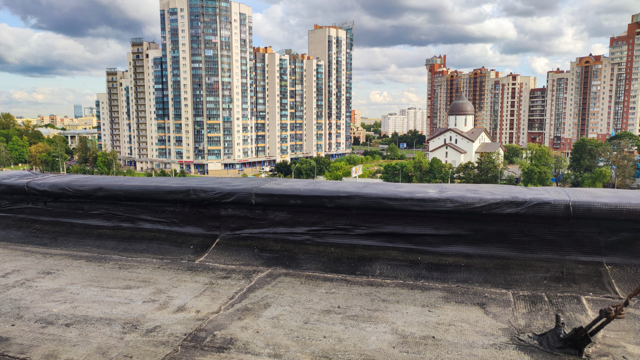 Снимок с крыши показывает вид на современные многоэтажные жилые здания и православную церковь с куполом на переднем плане. На переднем плане — рулонное кровельное покрытие с парапетом и элементами инженерной инфраструктуры. Фото отражает контраст между современной и традиционной архитектурой Санкт-Петербурга. Используется в статьях об урбанистике, строительстве и развитии городской среды.