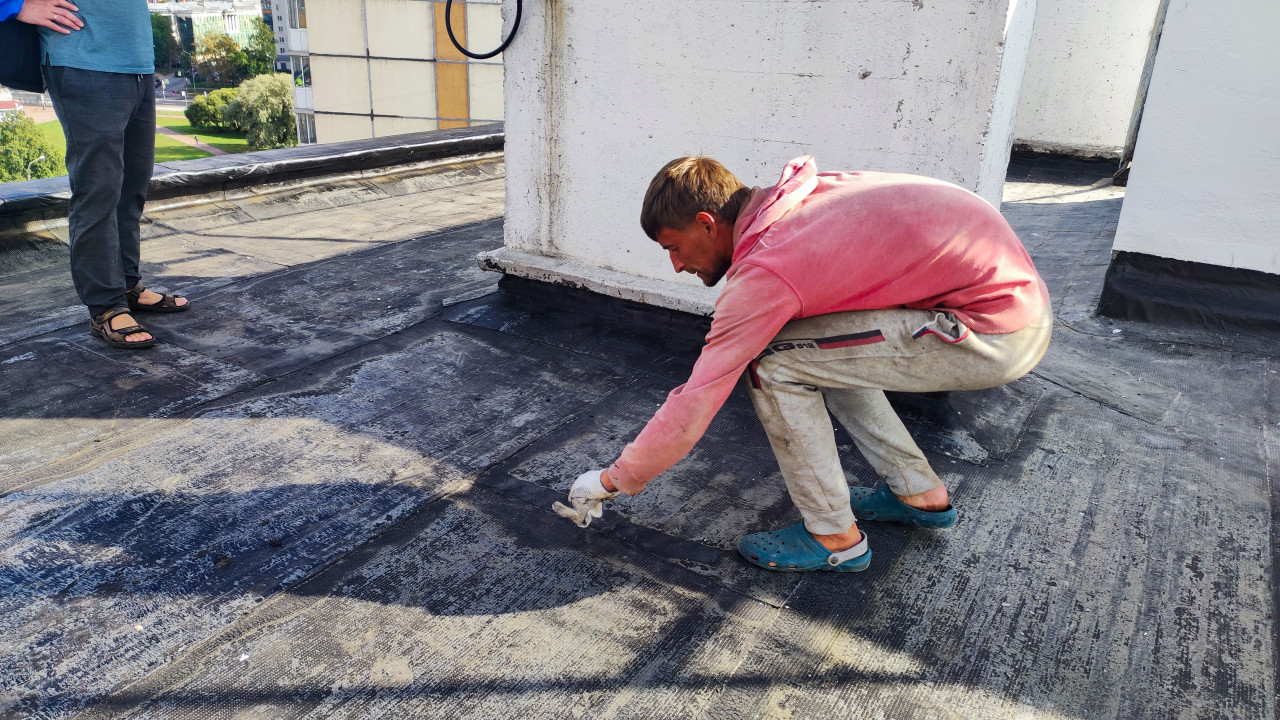 крыша ремонт крыши крыша здания износ кровельные работы ремонт кровли повреждения крыши кровля кровельное покрытие крыша дома герметизация рулонное покрытие шпатель строитель мастика кровельщик технический надзор осмотр кровли обслуживание зданий ремонт плоская крыша многоэтажный дом строительные процессы проверка инженерное обследование обслуживание кровли защита от протечек строительный контроль безопасность рабочие эксплуатация зданий текущий ремонт строительная экспертиза строительные материалыПохожие фотографии