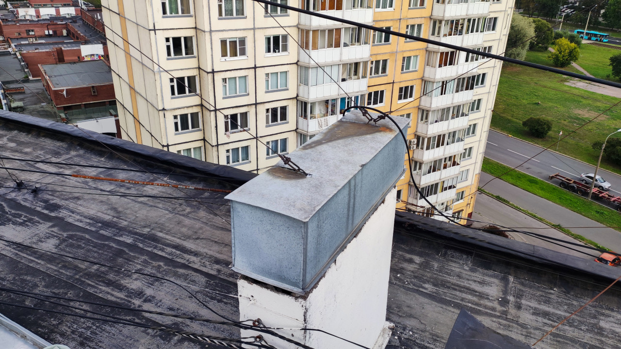 На фотографии изображён металлический вентиляционный короб, установленный на кровле многоэтажного дома. Видны натянутые стальные тросы молниезащиты, а также фасады соседних жилых зданий с балконами и окнами. Съёмка с высоты фиксирует элементы инженерных систем и общее состояние кровельного покрытия. Фото может использоваться в технической документации, строительных отчётах и материалах по обследованию зданий.