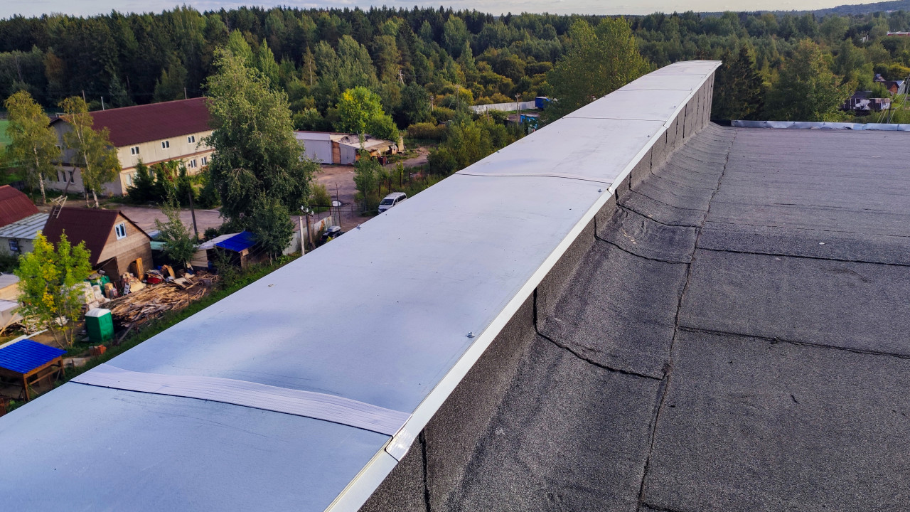 Парапет крыши с металлическим покрытием и видом на частный сектор