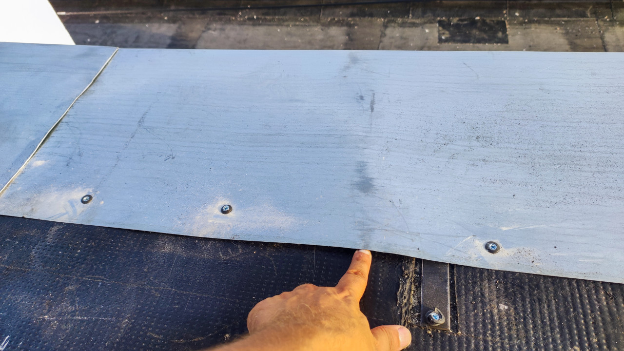 На снимке показана рука, указывающая на место соединения металлического нащельника с битумным покрытием на парапете плоской кровли. Крепежные элементы зафиксированы саморезами с пресс-шайбами. Поверхность листа имеет следы механических воздействий и строительной пыли. Фото отражает процесс визуального осмотра качества монтажа кровельных элементов. Материал подходит для иллюстрации строительных отчетов, актов осмотра и обучающих пособий по ремонту кровель.