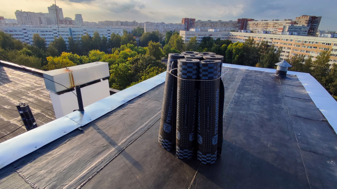 Новое рулонное кровельное покрытие и материалы «Технониколь» на крыше здания