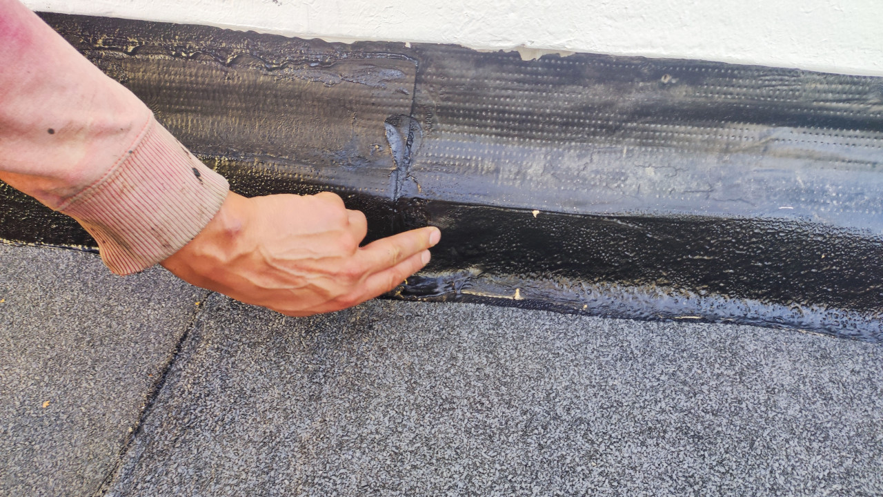 На фото изображён участок примыкания рулонной кровли к стене, который осматривает рабочий. Его рука указывает на место соединения гидроизоляционных слоёв, обработанных битумной мастикой. Снимок демонстрирует процесс визуального контроля качества герметизации в ходе кровельных работ. Чётко различимы фактура битумного слоя и структура кровельного ковра. Изображение подходит для использования в материалах по строительному контролю, обучающих пособиях для кровельщиков и отчётах по экспертизе кровель.