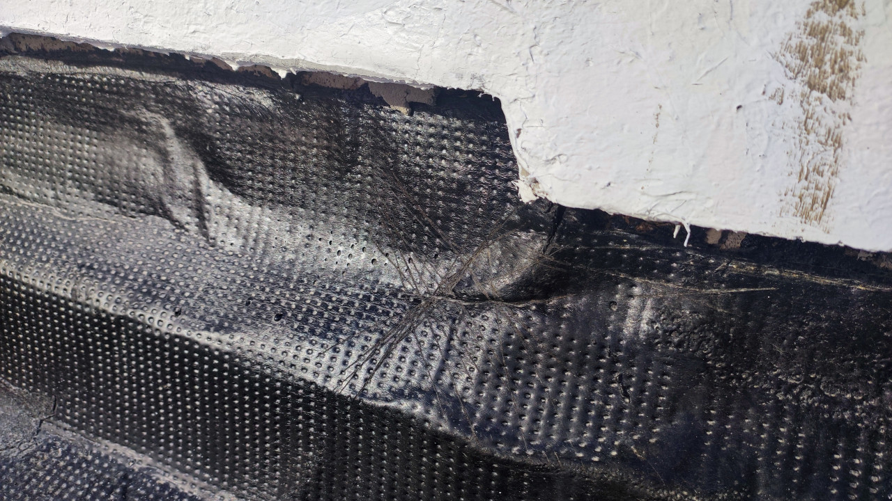 На фотографии запечатлён фрагмент старого кровельного покрытия в месте примыкания к стене, где наблюдается разрушение штукатурного слоя и отслоение гидроизоляции. Поверхность рулонного материала потемневшая, местами вздутая, с видимыми механическими повреждениями. Белая окрашенная стена имеет трещины и отколы, указывающие на износ конструкции. Снимок подходит для технических отчётов, строительных экспертиз, актов осмотра зданий и иллюстраций по дефектам кровельных узлов.