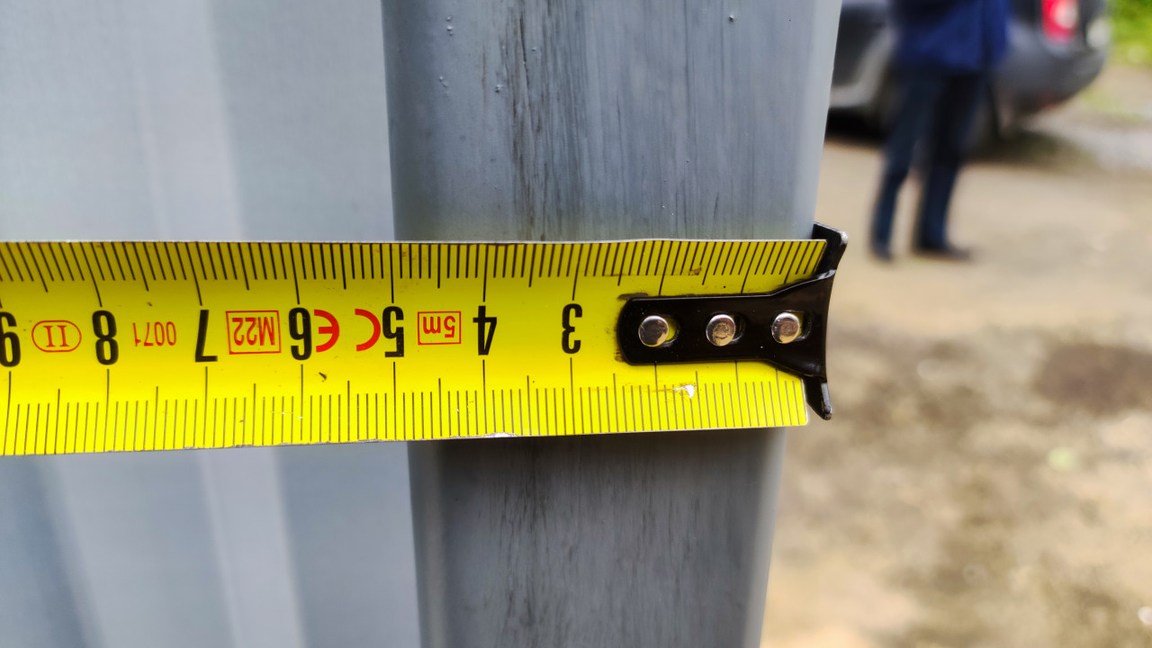 Замер толщины металлической стойки рулеткой