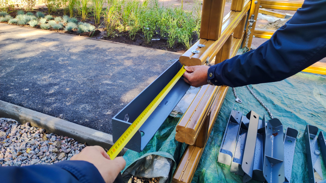 На снимке два человека измеряют металлический профиль с помощью рулетки. Элемент конструкции лежит на зелёной защитной плёнке, рядом находятся детали из металла и дерева, цепи и крепёжные элементы. Фон составляют асфальтированная дорожка и участок с декоративными растениями. Изображение показывает процесс технического контроля при сборке элементов детской площадки или малой архитектурной формы. Фото подходит для публикаций о строительстве, инженерных работах и контроле качества монтажа.