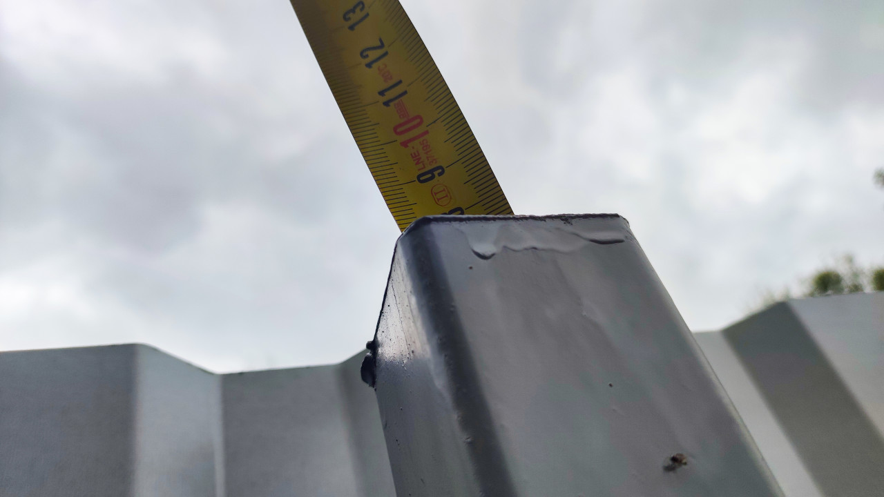 На фотографии изображён верхний участок металлической стойки с нанесённым слоем краски, к которому приложена рулетка для измерения высоты. Показания шкалы фиксируют уровень около 10 сантиметров. На заднем плане — светлое небо и фрагменты профлиста, используемого как ограждение. Снимок иллюстрирует этапы контроля параметров при установке металлических конструкций и может использоваться в технических публикациях, инструкциях и материалах по монтажу.