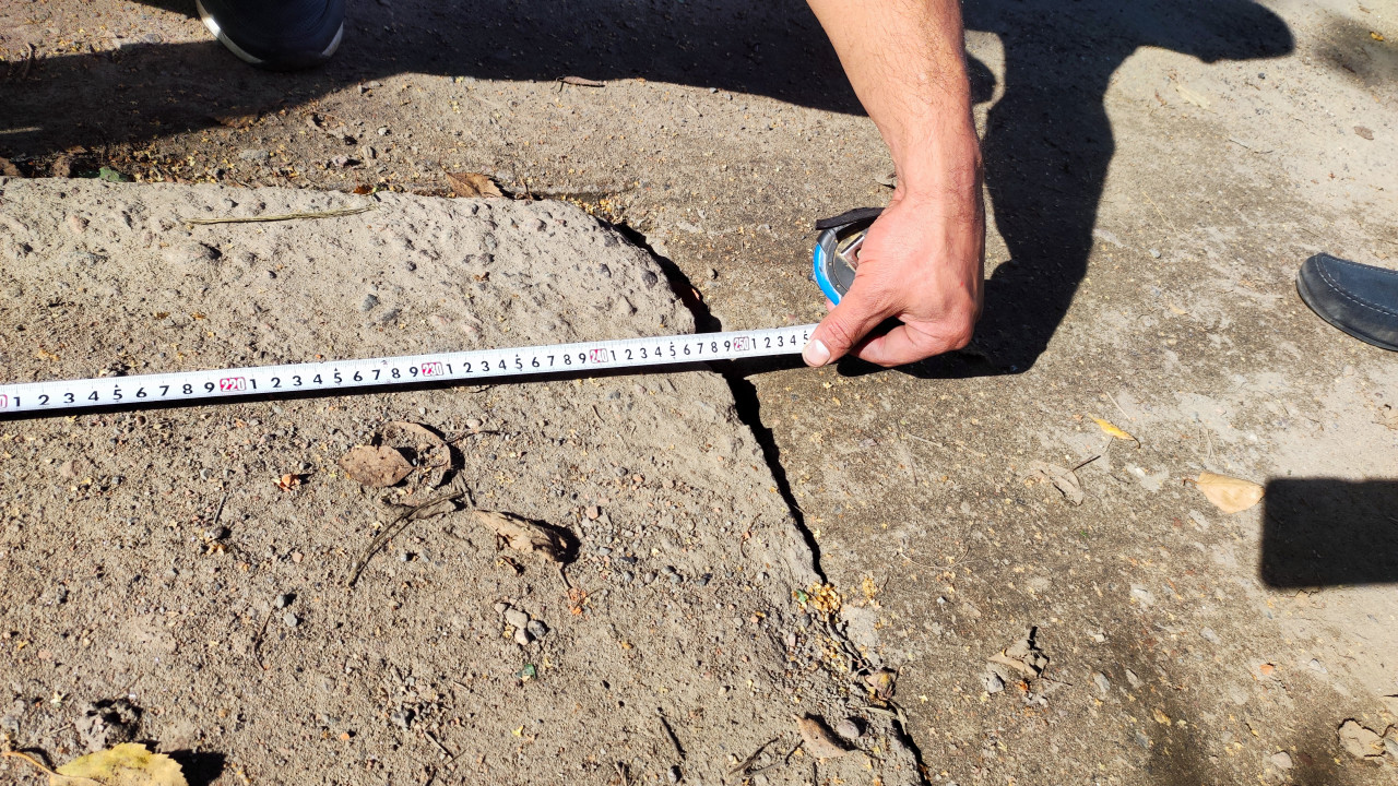 На фотографии запечатлён процесс измерения бетонной плиты при помощи металлической рулетки. Измерительный инструмент показывает длину около 2,4 метра. Поверхность плиты частично покрыта грунтом и мелкими камнями, рядом видны руки человека, выполняющего замер. На заднем плане — участок дороги с пылевым покрытием. Снимок иллюстрирует процесс технического обследования дорожных элементов, используется для отчётов и строительных экспертиз.