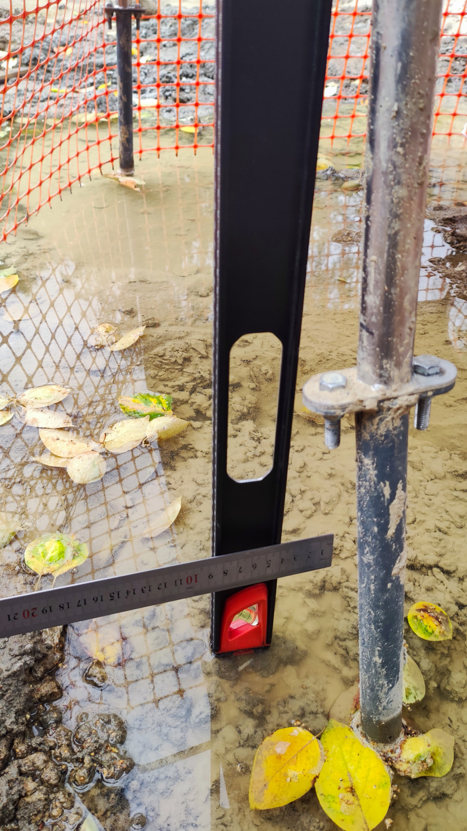 На снимке показан процесс измерения расстояния между металлическими опорами установленной горки. Используются строительный уровень и металлическая линейка, что позволяет контролировать точность монтажа и вертикальность элементов. Под опорами виден влажный глинистый грунт и вода после дождя, рядом лежат жёлтые осенние листья. На заднем плане — фрагменты сигнальной сетки, ограничивающей доступ к строительной зоне. Изображение иллюстрирует строительный надзор и выполнение норм безопасности при установке детского оборудования.