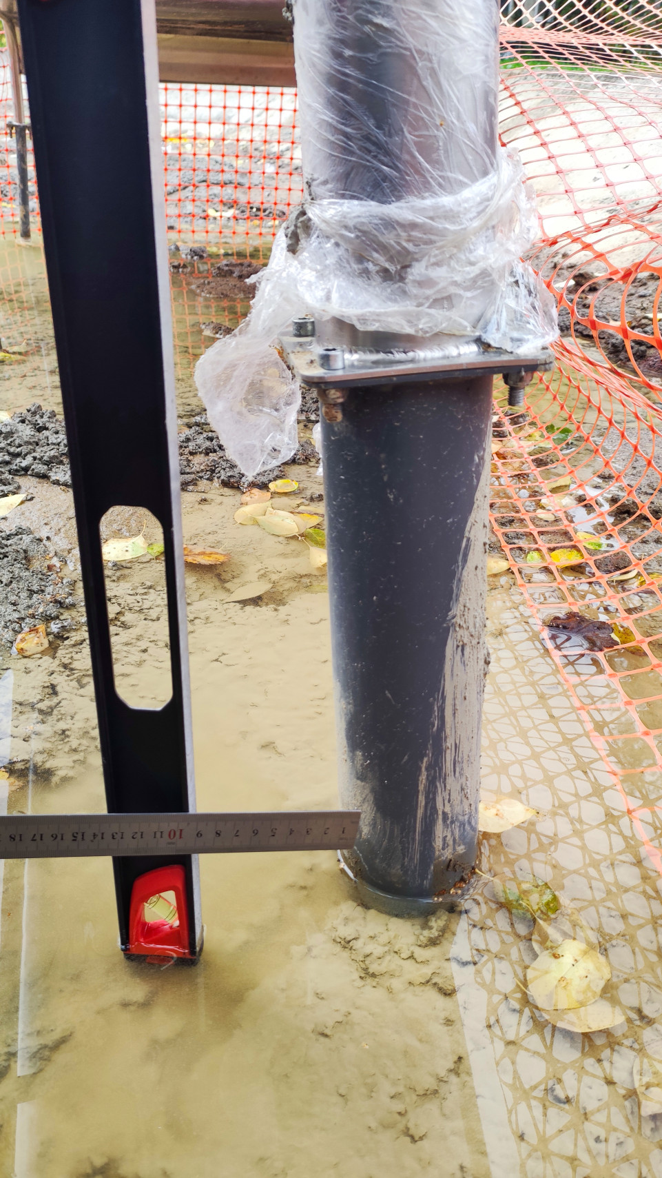 На фотографии запечатлён процесс измерения расстояния между металлической опорой детской горки и строительным уровнем. Работы выполняются на стройплощадке после дождя — на поверхности видна грязь, лужи и опавшие листья. Металлическая стойка частично обёрнута защитной плёнкой, основание закреплено болтами к фланцу. Оранжевая сигнальная сетка по периметру служит ограждением рабочей зоны. Фото иллюстрирует процесс контроля точности монтажа игрового оборудования и пригодно для использования в инженерной, строительной и экспертной документации.