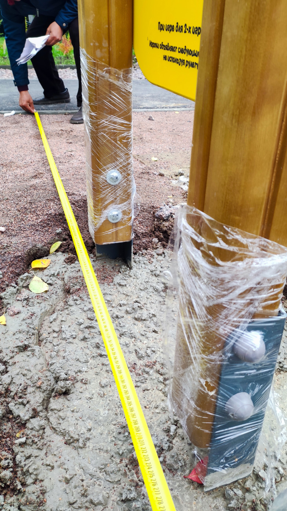 На фото зафиксирован процесс измерения расстояния между деревянными стойками детского игрового комплекса с помощью рулетки. На стойках видна защитная упаковка, основание зафиксировано в свежем бетоне. На заднем плане — человек, участвующий в строительных работах. Снимок иллюстрирует этап контроля точности монтажа оборудования на благоустраиваемой территории.