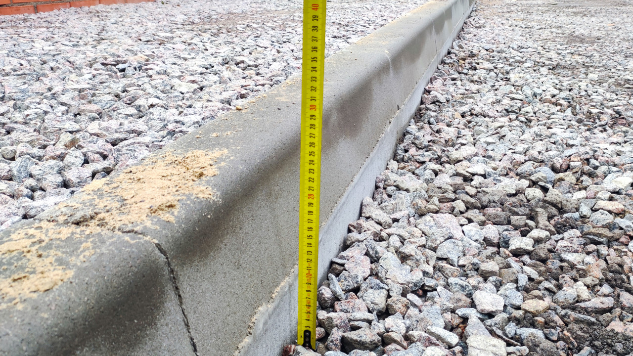 На фотографии показан процесс измерения высоты бетонного бордюра относительно щебёночного основания. Желтая рулетка фиксирует показатель около 19 сантиметров. На фоне виден слой крупного щебня, подготовленный под будущую укладку покрытия, а также кирпичная стена. На бордюре заметен песок, оставшийся после подсыпки. Сцена иллюстрирует контроль геометрических параметров при благоустройстве территорий. Изображение подходит для использования в статьях о дорожном строительстве, инженерных измерениях и стандартах качества выполнения работ.