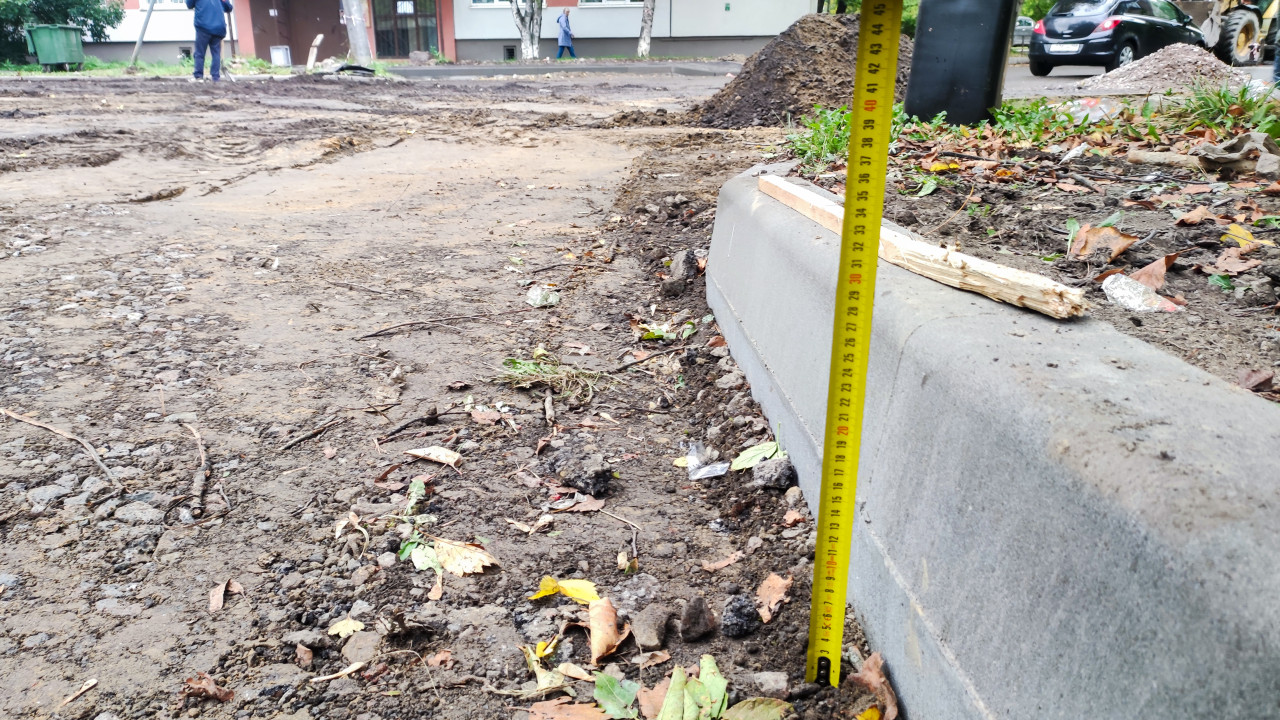 На снимке запечатлён процесс проверки высоты бетонного бордюра в зоне благоустройства жилого квартала. Рулетка фиксирует отметку около 22 сантиметров. На переднем плане — земляное основание с остатками листьев и строительного мусора. На заднем плане видны люди и припаркованные автомобили, что подчёркивает контекст жилой застройки. Сцена иллюстрирует практическую часть строительного контроля при монтаже элементов благоустройства. Фото может использоваться в публикациях о дорожном строительстве, стандартах качества и работе инженерных служб.