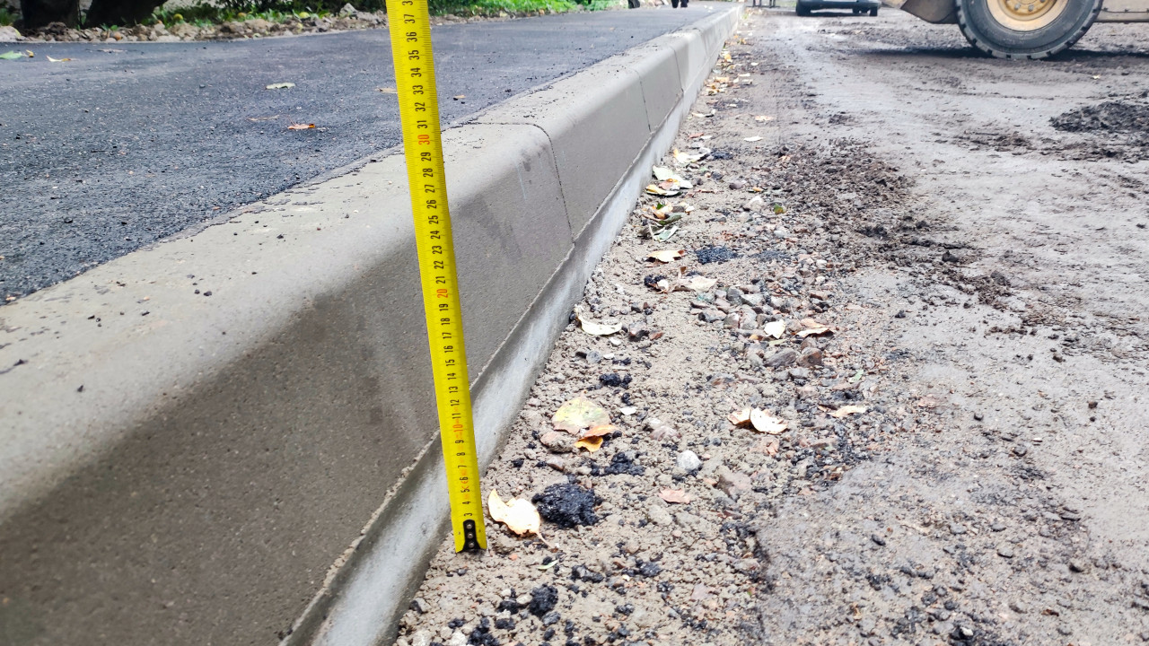 На фото запечатлён процесс измерения высоты бордюра относительно свежего асфальтового покрытия. Желтая рулетка показывает отметку около 19 см. Поверхность дороги уже частично выровнена и уплотнена, виден слой асфальта с характерной структурой. На заднем плане можно различить колесо дорожной техники и рабочие элементы благоустройства. Снимок иллюстрирует технический контроль в ходе дорожно-строительных работ. Фото подходит для профессиональных публикаций о стандартах качества, строительных нормах и методах измерений при благоустройстве территорий.